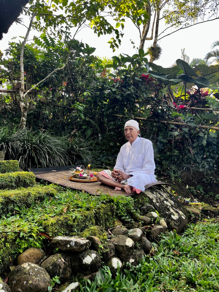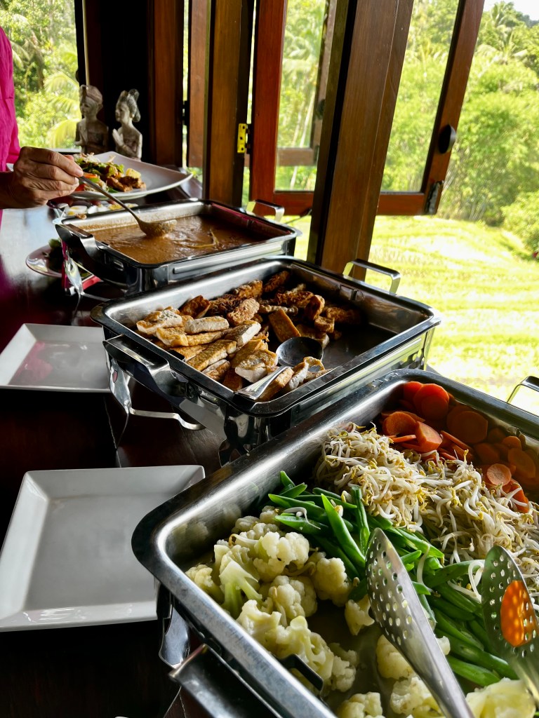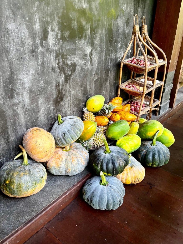 Every day the local elder, dressed in traditional garb, prepared floral offerings and delivered them to our bungalows, the temples in the gardens, and to the sacred waterfall, making every day feel blessed indeed. On our first day the local women dressed us up in traditional kebayas with sashes and taught us how to prepare our own floral tributes then led us to the temple to offer them to the gods of the property, the river and the village, to bless us all, and all the staff. We even blessed the kitchen utensils! To close the ceremony, we daubed our foreheads and throats with grains of rice, tucked flowers behind our ears and scattered them through our hair. Such a beautiful ritual and an honour to be included in this sacred ceremony.