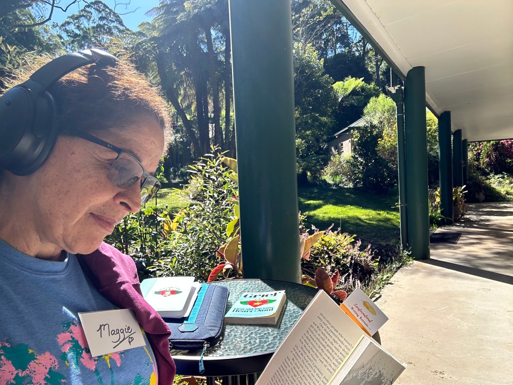 We had a wonderful group, our beloved retreataholics leading the pack, and a whole lot of new writers, testing the waters, trying out their writing chops and escaping the pressures of daily life to hide in the mountains and write. We had a lot of Gold Coast Writers this retreat, who I hope will form their own ongoing writing gang to share work. Our precious Faye came all the way from New Zealand – the retreat a birthday gift to herself. Amelia’s hubby gave her the retreat for her birthday and Angela flew up from Melbourne in search of an affordable retreat.