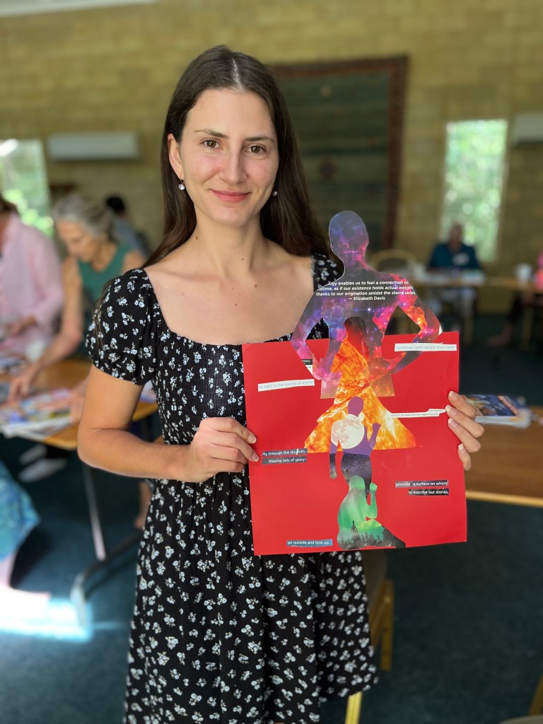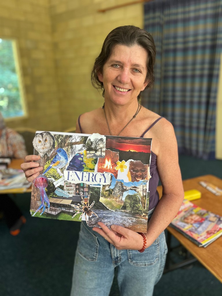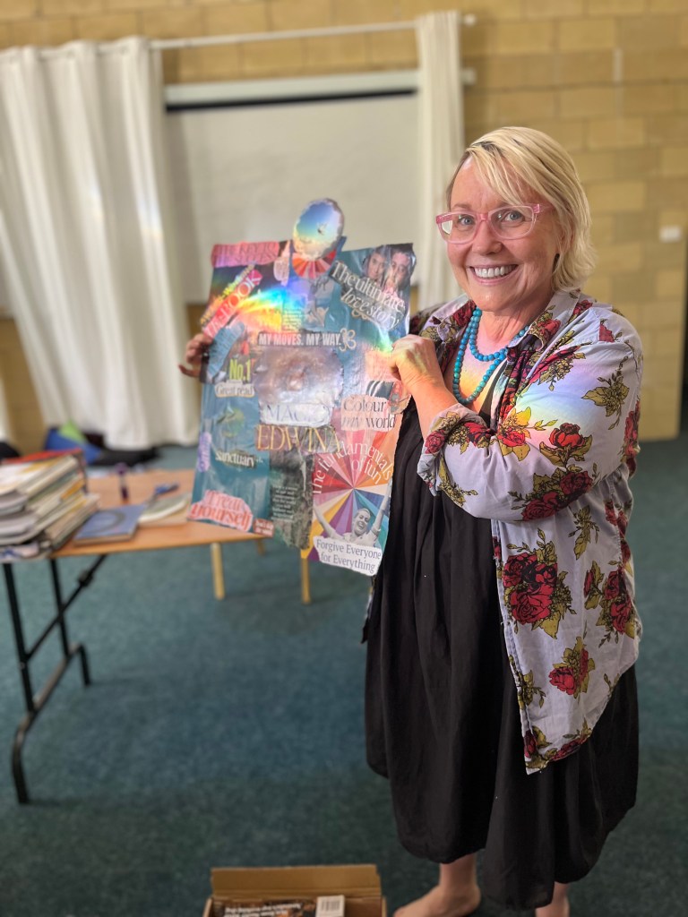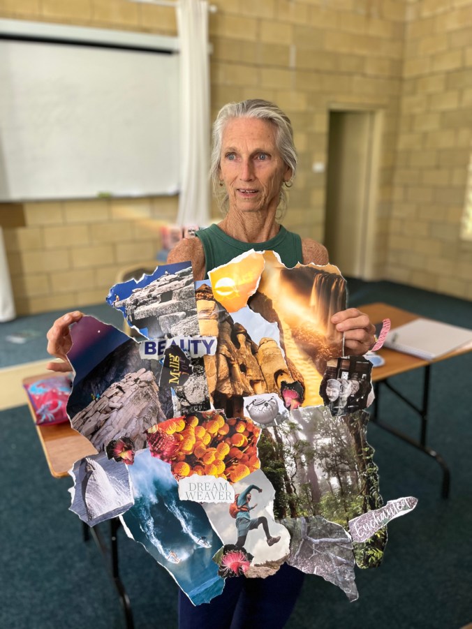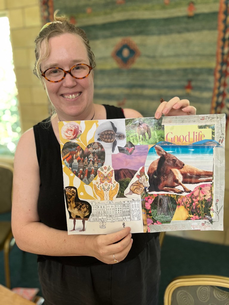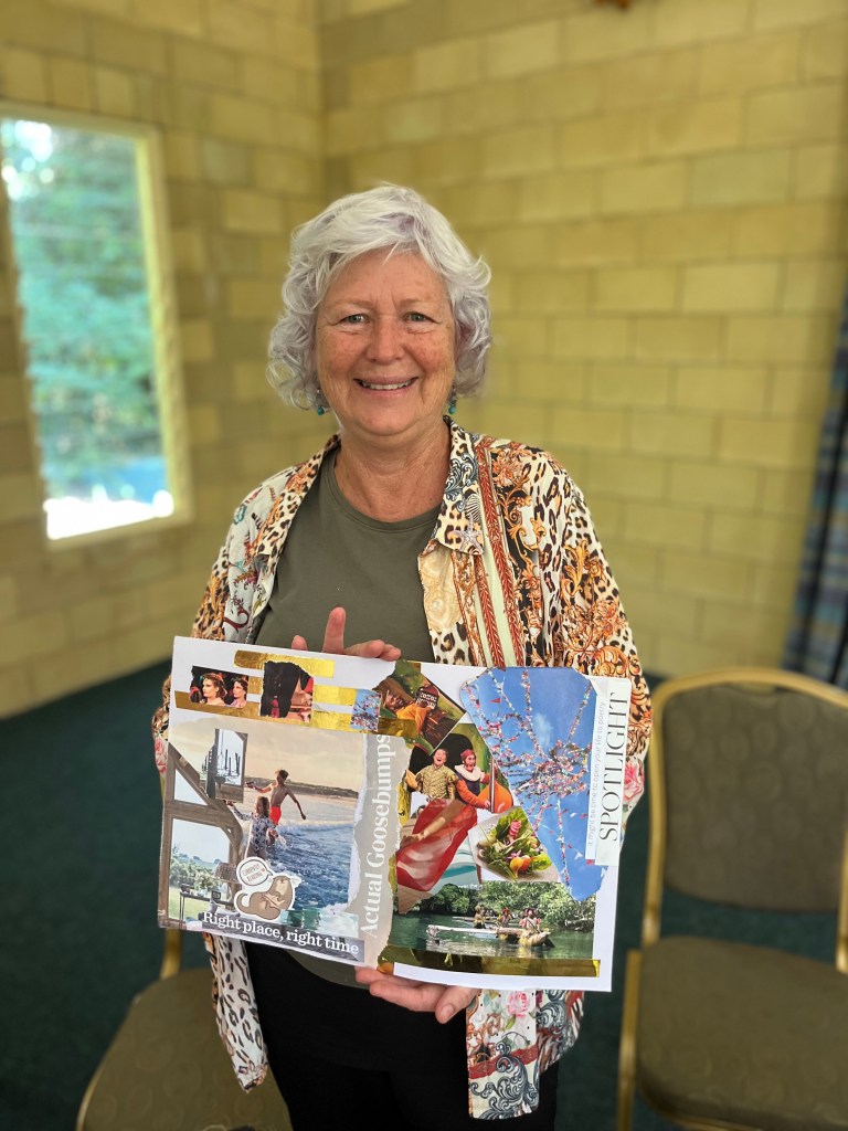 Happy campers with their collages. Traditional kindy photo to finish retreat. From top left: me, Anne, Angela, Katie, Faye, Sue, Helen, Liana, Jeanelle, Amelia, Bev, Rebecca and Shannon 🙂