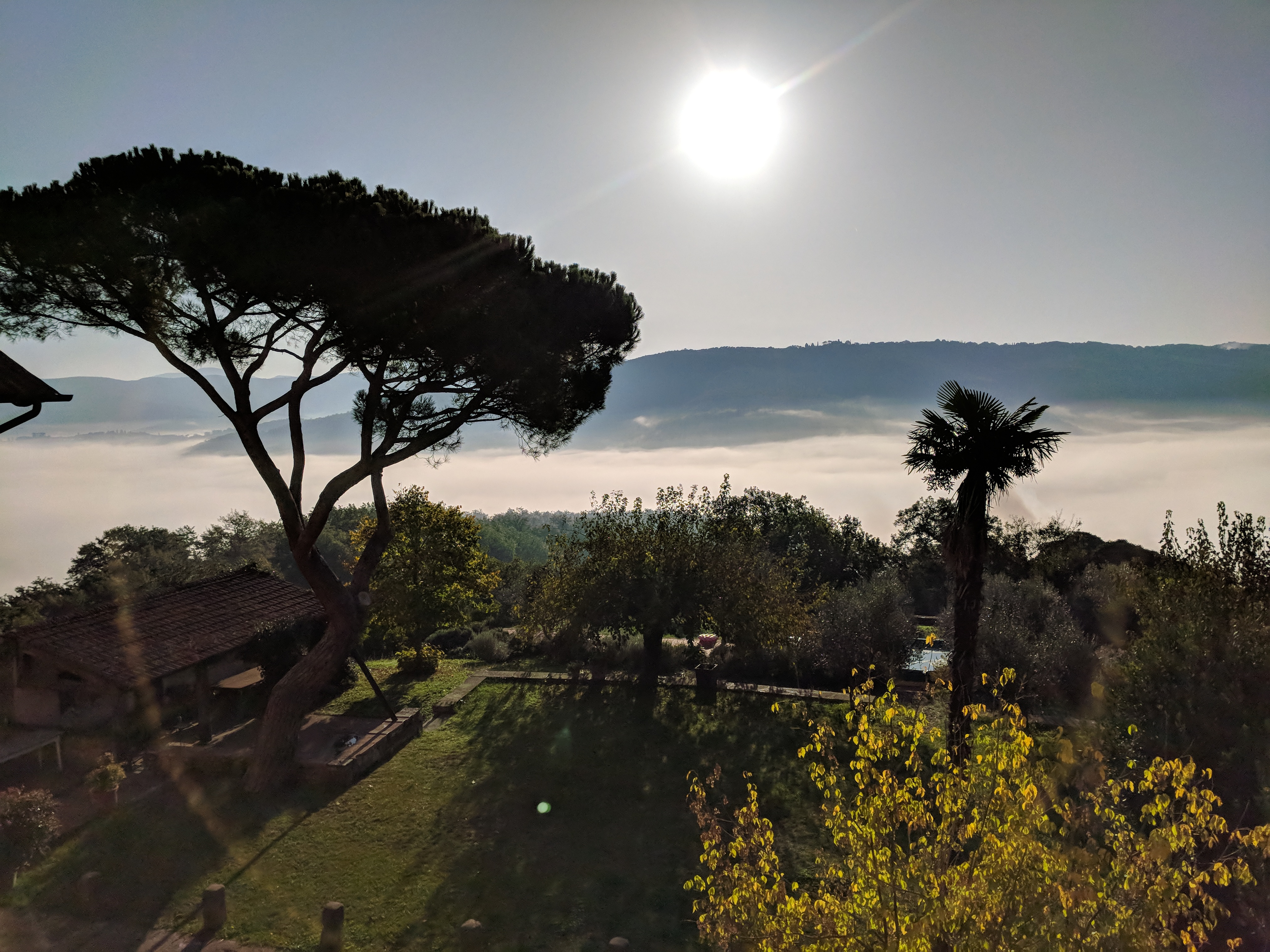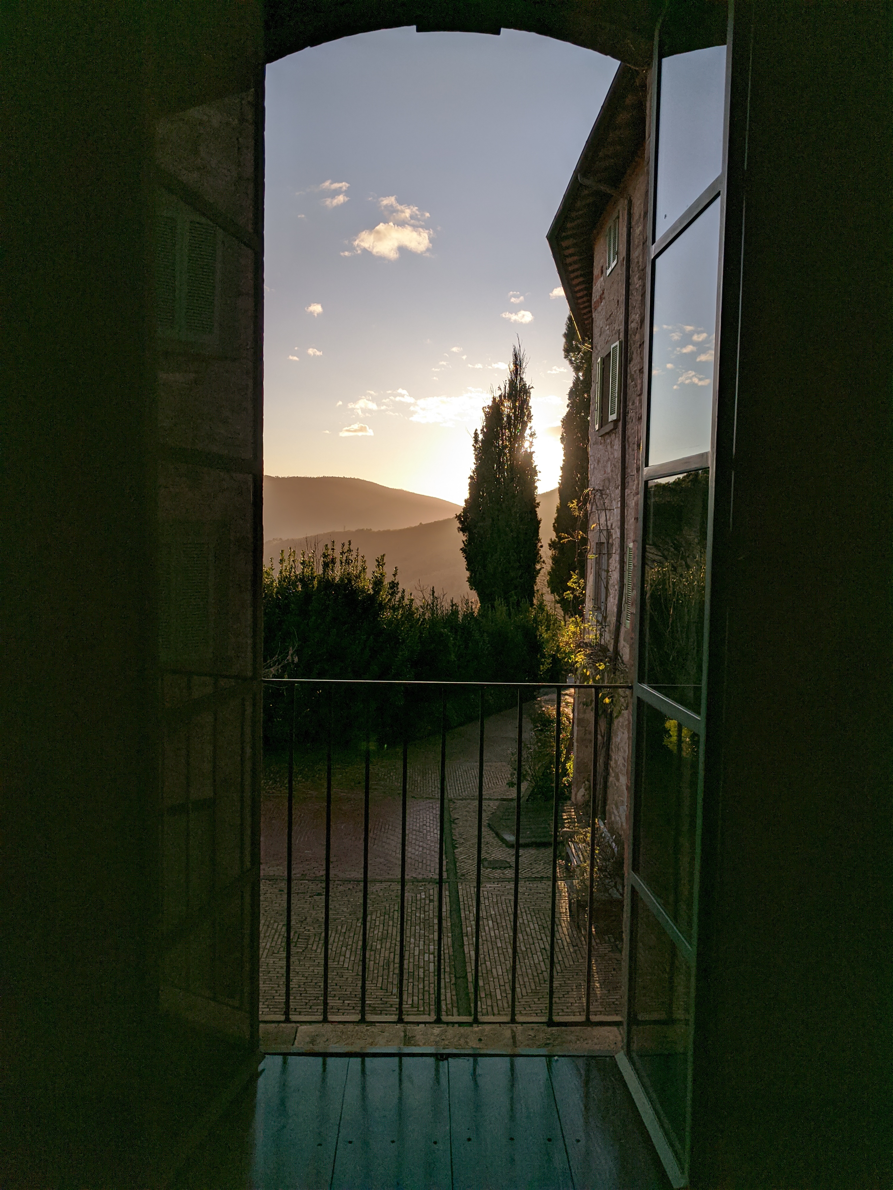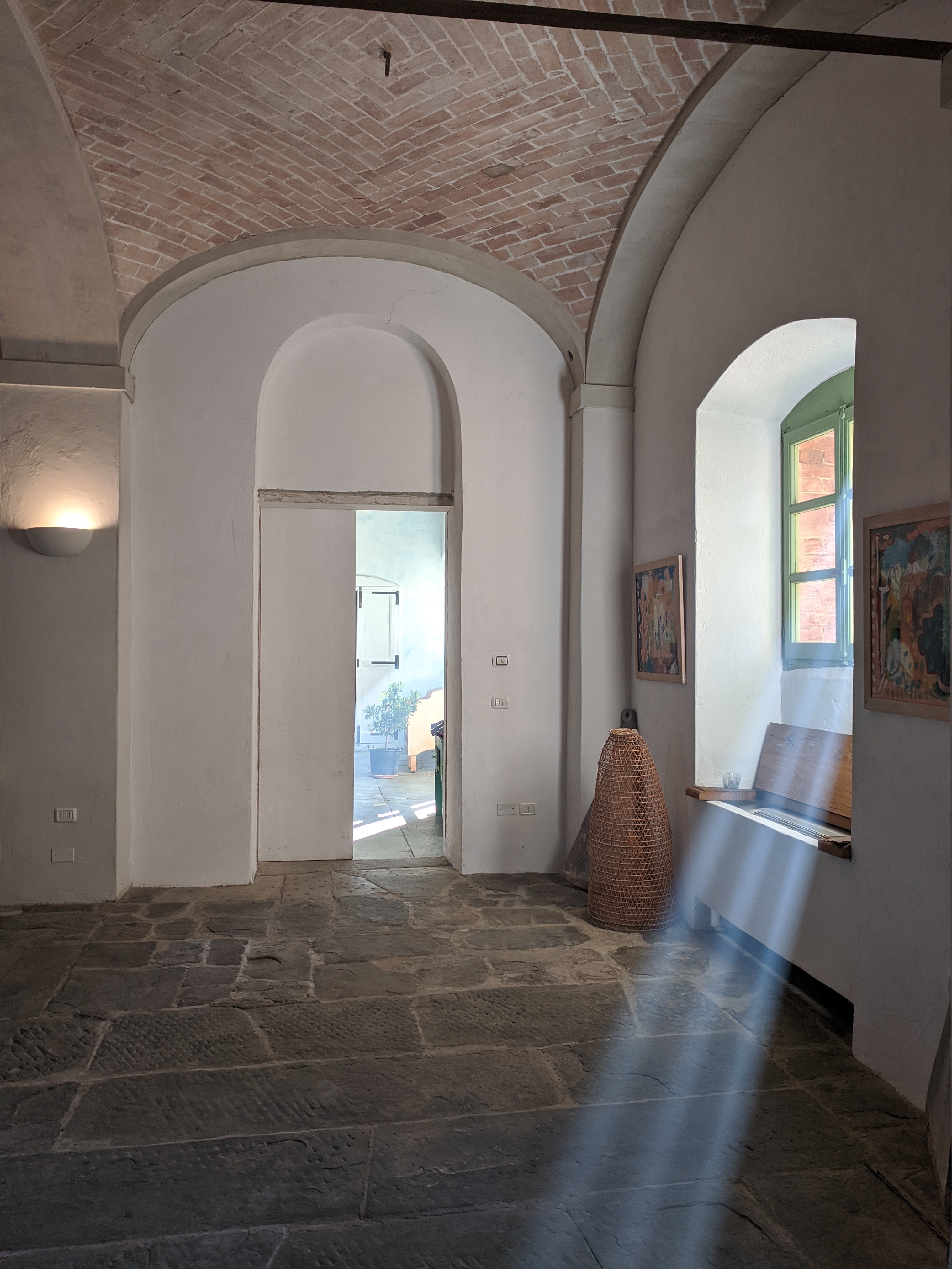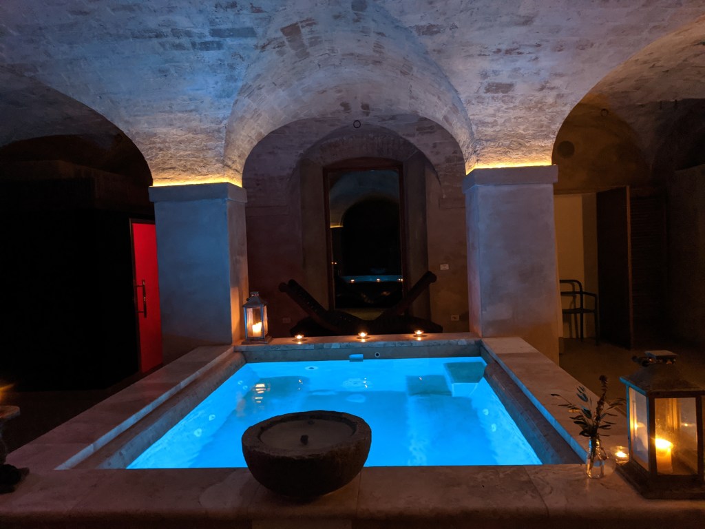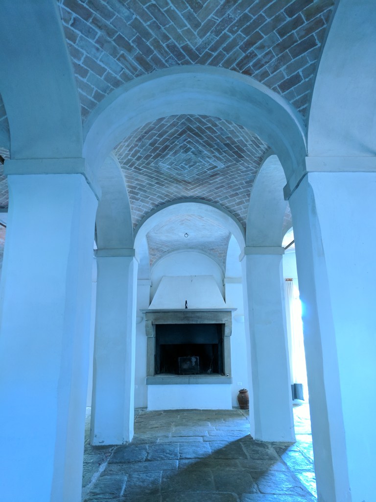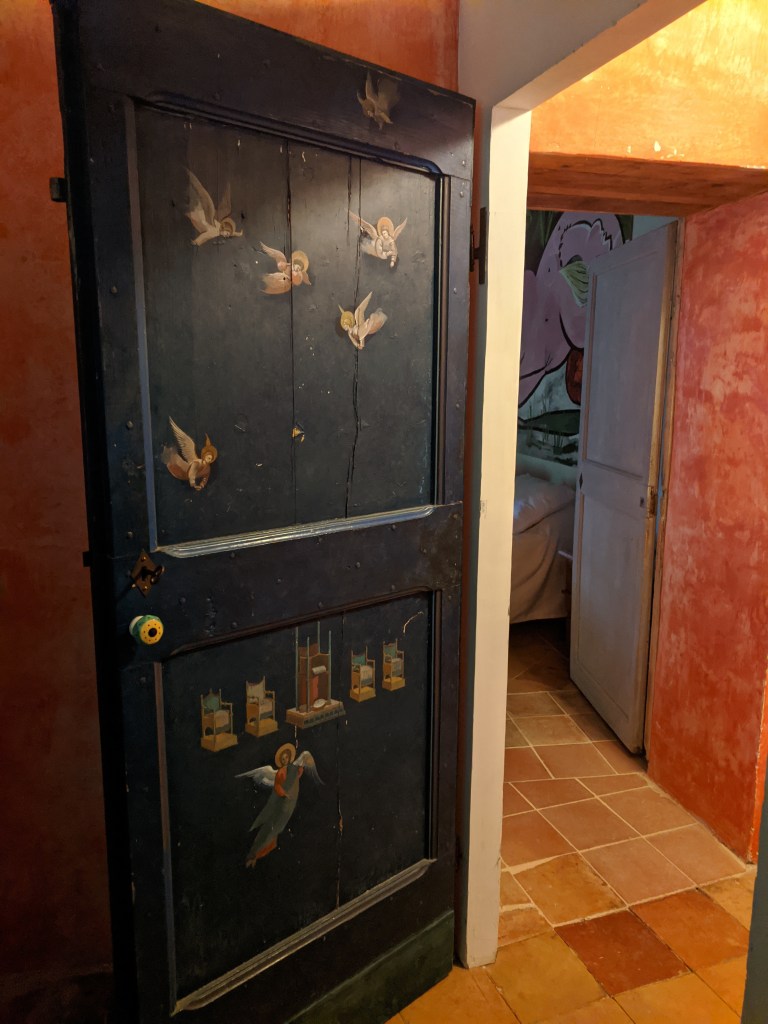 But as soon as we arrived and our delightful hosts, Krizsti and Luca, carried our bags up to our rooms and showed us around, we knew we’d found somewhere very special indeed. Every room is beautiful in its own way, some with Luca’s original artworks decorating the walls, some with restored frescoes, Anna’s door resplendent with angels. Sleek, modern, heated bathrooms, air-conditioning in every room, crisp ironed sheets and fresh flowers from the garden on the writing desks ticked every box. Magnificent views over the surrounding hills and valleys brought light and joy from every window.Â