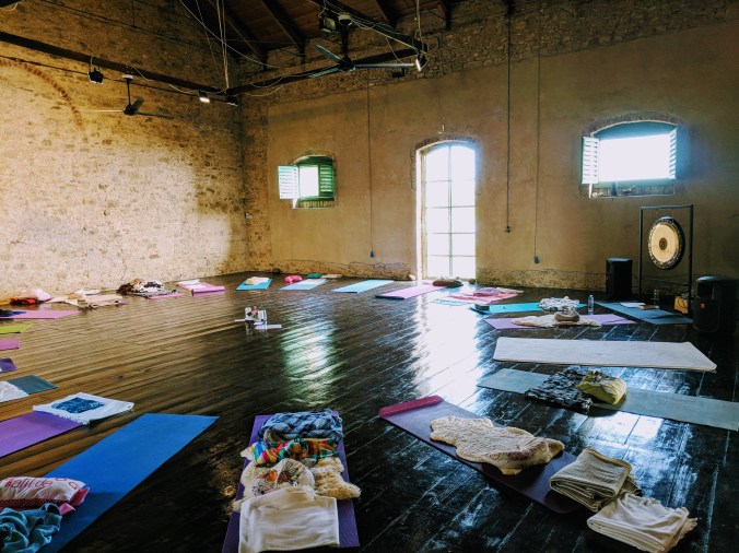 The yoga shala, in the converted barn, is every yogin’s dream. The floor in the shala has wide weathered wooden floorboards, polished and worn from use. Huge arched windows let in the sun and views and newly installed heating ensured we were toasty warm even on the coldest mornings.
