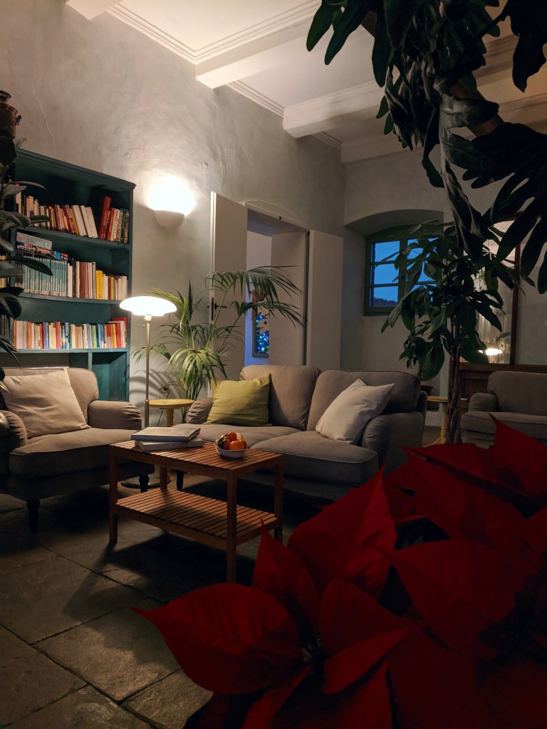 The main teaching rooms and dining hall cover the main floor of the converted barn, a huge pine fire roaring in the fireplace far into the night. Comfy lounges in cosy corners were perfect for chatting with other writers. We had tables to work at and Sergio and Anne-Claire and the team in the kitchen serving us delicious meals every few hours. But the breakfast room tops the lot. A recent addition to the centre, this stunning glass-walled suntrap makes the most of the stunning location and every morning we tramped down from yoga to find a sumptuous buffet of fruit, cereals, smoked salmon, cheeses and ham, breads and just about everything imaginable on your dream breakfast menu.